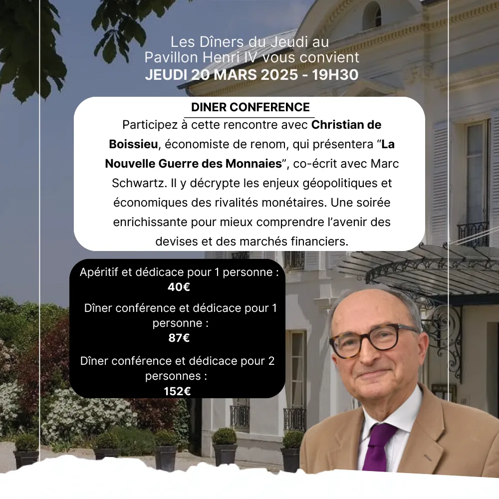 Participez à cette rencontre avec Christian de Boissieu, économiste de renom, qui présentera “La Nouvelle Guerre des Monnaies”, co-écrit avec Marc Schwartz. Il y décrypte les enjeux géopolitiques et économiques des rivalités monétaires. Une soirée enrichissante pour mieux comprendre l’avenir des devises et des marchés financiers.
